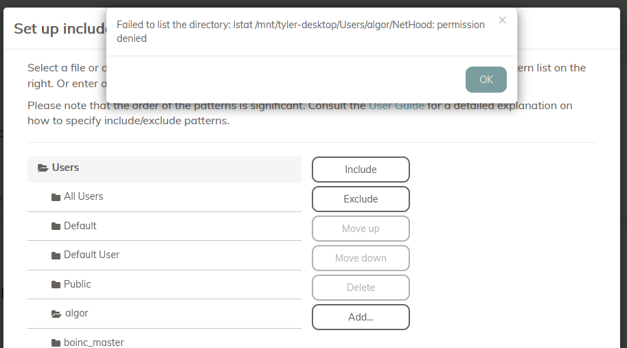 When setting up include/exclude patterns, or selecting the path for the backup, I can expand /folder, but expanding /folder/user-1 gives an error because /folder/user-1/sub2 cannot be read due to a permissions error.